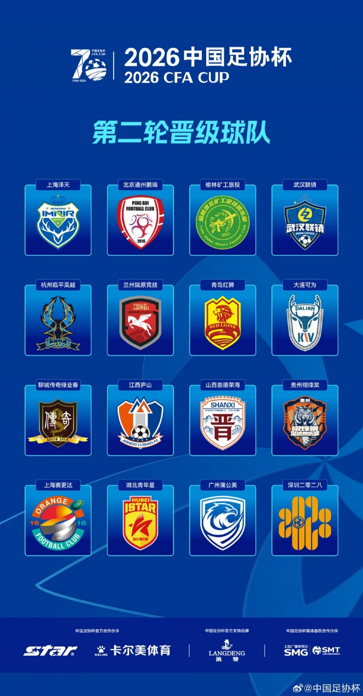 直播吧4月21日讯 4月18日-20日,2026中国足协杯第二轮比赛全面展开,其中3场比赛进入点球决胜。经过激烈的竞争,9支中乙球队出局,大连可为、上海赛更达、湖北青年星在“中乙内战”中占据上风,6支业余球队上海泽天、榆林矿工旅投、北京通州鹏瑞、贵州栩烽棠、武汉联镇、聊城传奇绿业春爆冷挺进到足协杯第三轮。